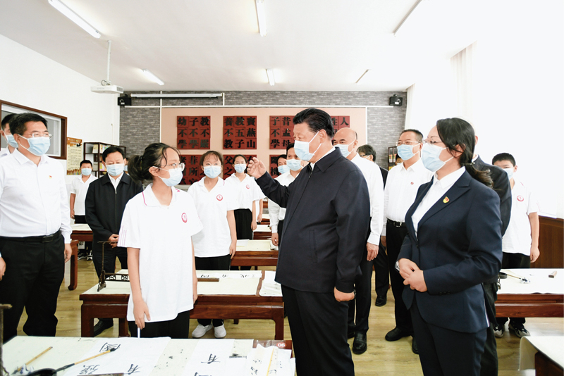 2021年9月13日至14日,中共中央總書記、國家主席、中央軍委主席習近平在陜西省榆林市考察。這是14日上午,習近平在綏德實驗中學考察時,同正在練習書法的學生親切交流。新華社記者 李學仁/攝