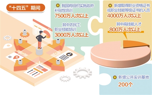在1月7日舉行的國務(wù)院政策例行吹風(fēng)會上,人力資源社會保障部副部長湯濤表示,為提升勞動者就業(yè)創(chuàng)業(yè)能力,滿足產(chǎn)業(yè)轉(zhuǎn)型升級和技術(shù)進(jìn)步的要求,“十四五”期間,我國將組織實(shí)施政府補(bǔ)貼性培訓(xùn)達(dá)7500萬人次以上,其中農(nóng)民工職業(yè)技能培訓(xùn)3000萬人次以上;新增取得職業(yè)資格證書或職業(yè)技能等級證書的人員達(dá)到4000萬人次以上,其中能夠達(dá)到高級技工、技師、高級技師的高技能人才達(dá)到800萬人次以上;新增公共實(shí)訓(xùn)基地200個。