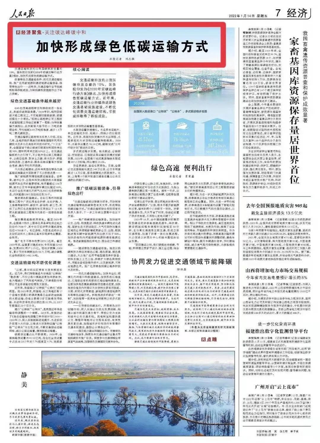 近年來,交通運輸行業(yè)持續(xù)推進綠色交通基礎設施建設,不斷優(yōu)化調(diào)整交通運輸結構,節(jié)能減排取得了積極成效。1月14日,人民日報刊發(fā)“關注碳達峰碳中和”專題報道:《加快形成綠色低碳運輸方式》,全文如下↓↓↓