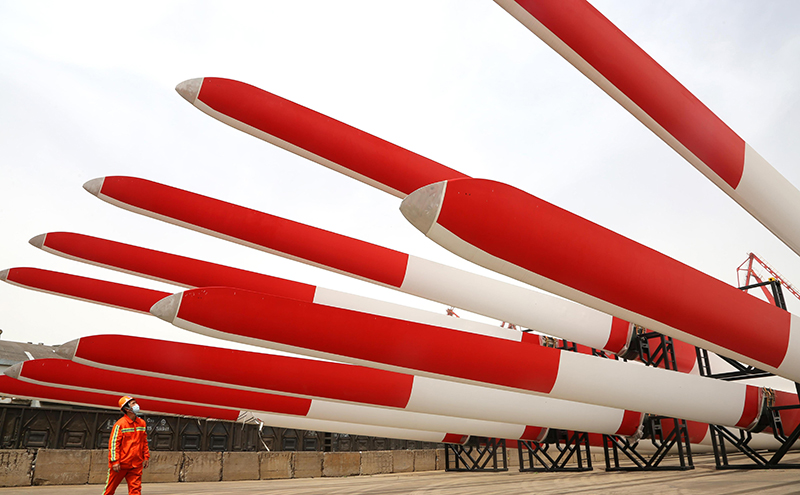風(fēng)力發(fā)電機(jī)葉片在江蘇連云港港碼頭等待裝船外運(2021年4月16日攝)。新華社發(fā)(王春 攝)