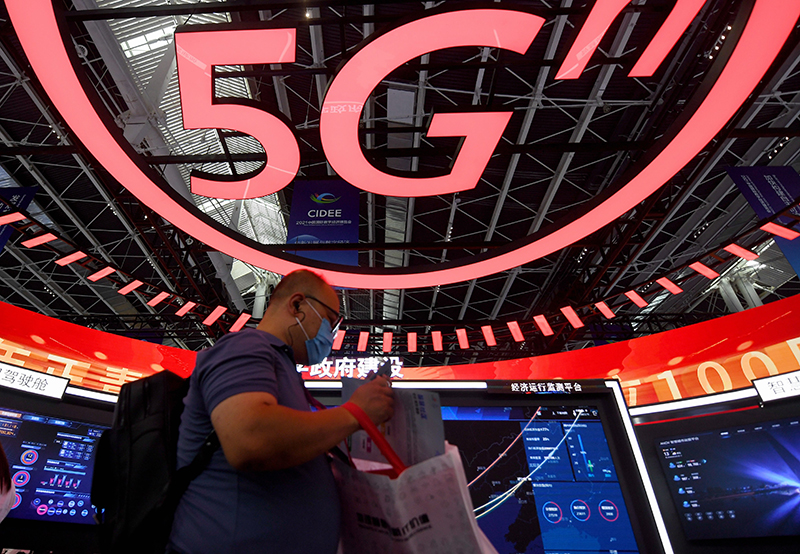 在河北省石家莊市舉行的2021中國國際數(shù)字經(jīng)濟(jì)博覽會上,參觀者走過5G智慧展區(qū)(2021年9月6日攝)。新華社記者 王曉 攝