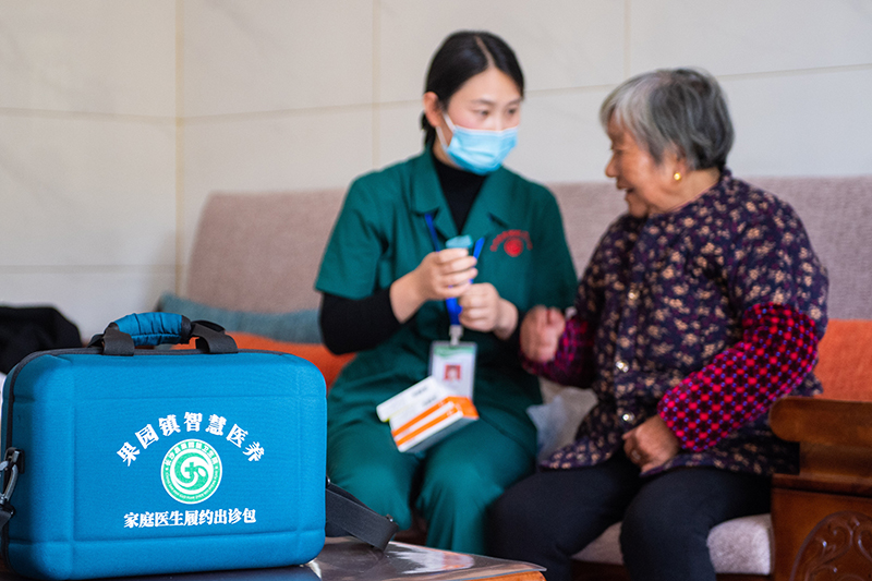 在湖南省長沙市長沙縣果園鎮(zhèn)楊泗廟社區(qū),醫(yī)務(wù)人員指導(dǎo)居家老人用藥(2021年11月12日攝)。新華社記者 陳思汗 攝
