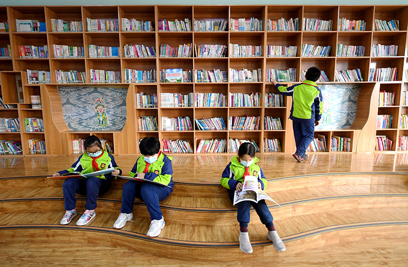河北省石家莊市橋西區(qū)裕華西路小學(xué)參加課后托管的學(xué)生在圖書館閱讀(2021年3月11日攝)。新華社記者 王曉 攝