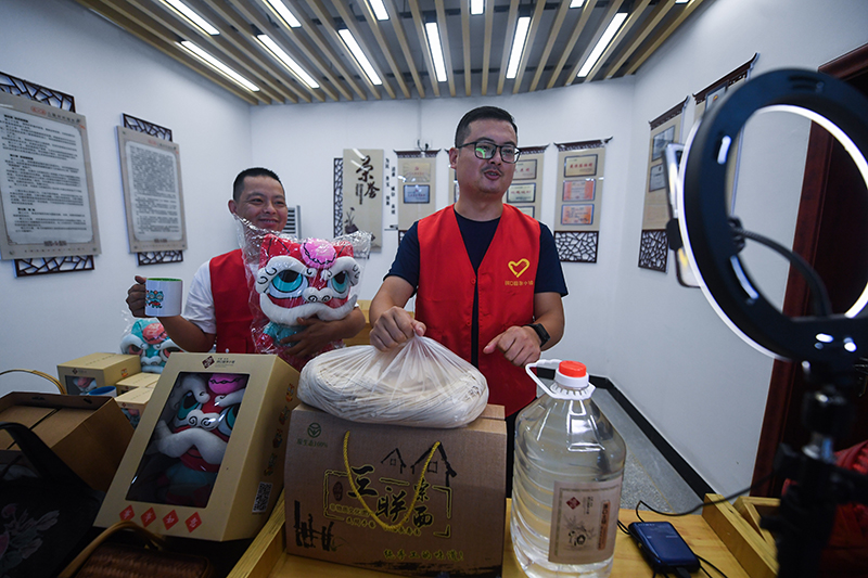 浙江省杭州市臨安區(qū)湍口鎮(zhèn)三聯(lián)村黨總支書記方剛(右)和黨員志愿者在村里直播間展示當(dāng)?shù)靥厣r(nóng)產(chǎn)品(2021年8月13日攝)。新華社記者 徐昱 攝