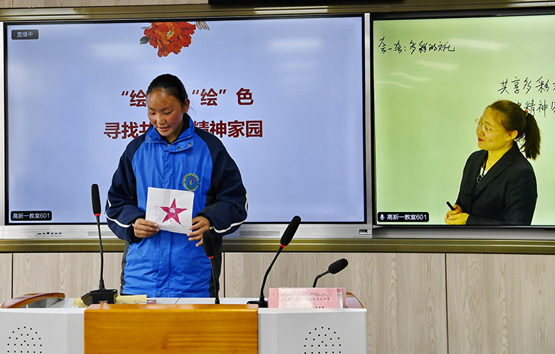 在“云?!闭n堂上,拉薩阿里地區(qū)高級(jí)中學(xué)一名學(xué)生(左)和西安高新第一中學(xué)老師互動(dòng)(2022年4月8日攝)。新華社記者 張汝鋒 攝