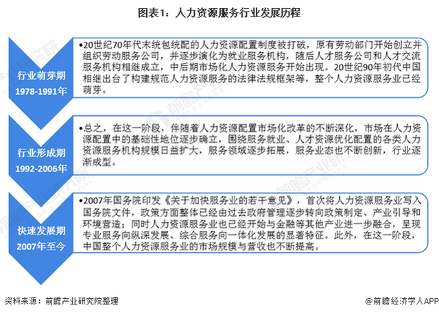 追溯整個人力資源服務(wù)行業(yè)的發(fā)展,大致可分為萌芽期、行業(yè)形成期與快速發(fā)展期三個階段,當前,我國人力資源服務(wù)行業(yè)正處于快速發(fā)展階段。