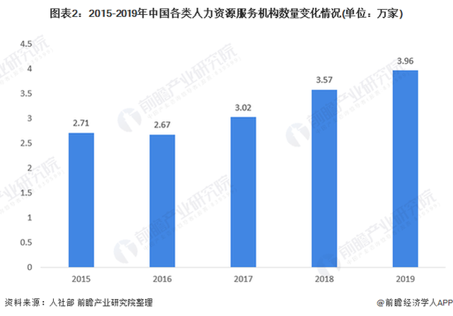 2015年以來,我國各類人力資源服務(wù)機構(gòu)數(shù)量整體呈上升趨勢。2019年,各類人力資源服務(wù)機構(gòu)數(shù)量穩(wěn)步增長,且新增機構(gòu)中90%以上為民營機構(gòu)。這主要得益于2018年《人力資源市場暫行條例》頒布實施后,進一步放寬人力資源市場準入,鼓勵社會力量參與,制定出臺相關(guān)扶持政策,增強了行業(yè)內(nèi)生發(fā)展動力。截至2019年底,全國各類人力資源服務(wù)機構(gòu)達3.96萬家。
