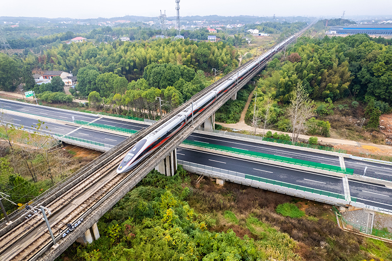 高鐵列車從湖南省首條智慧高速——湖南平江(湘贛界)至益陽高速公路上方駛過(2022年11月28日攝,無人機(jī)照片)。新華社記者 陳思汗 攝