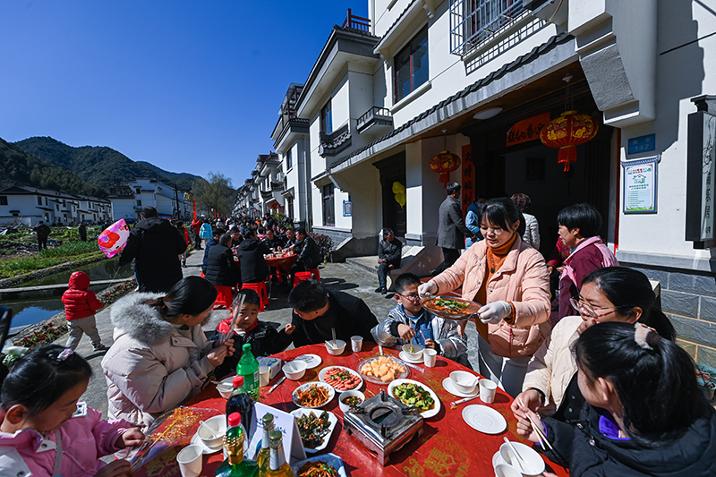 游客在浙江省建德市蓮花鎮(zhèn)戴家新村的百家宴上品嘗特色美食,感受新農(nóng)村“舌尖上的幸?!保?023年2月26日攝)。新華社記者 徐昱 攝