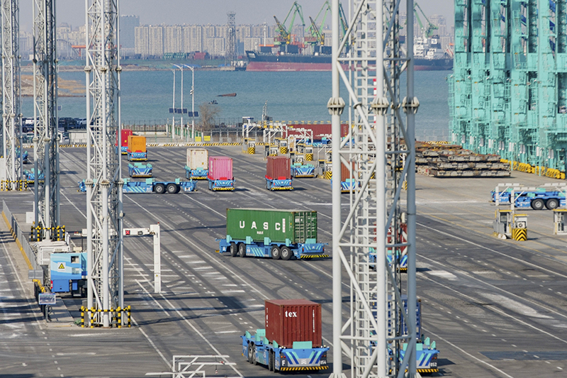 智能水平運(yùn)輸機(jī)器人在天津港全物聯(lián)網(wǎng)集裝箱碼頭作業(yè)(2023年2月21日攝)。新華社記者 張鋮 攝