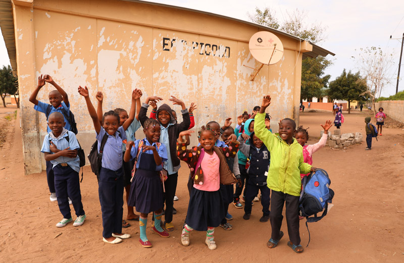 2023年7月25日,莫桑比克馬普托省皮科科村學(xué)校的孩子們站在裝有中國(guó)援助的衛(wèi)星電視接收天線的房屋前。新華社記者 董江輝 攝