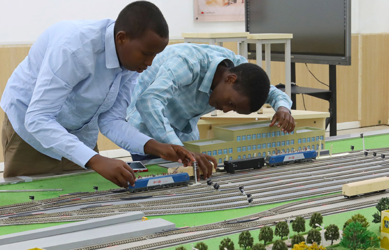 在位于吉布提首都吉布提市的吉布提工商學(xué)校,學(xué)生在魯班工坊鐵道運(yùn)營(yíng)沙盤教學(xué)區(qū)學(xué)習(xí)(2022年9月19日攝)。新華社記者 董江輝 攝