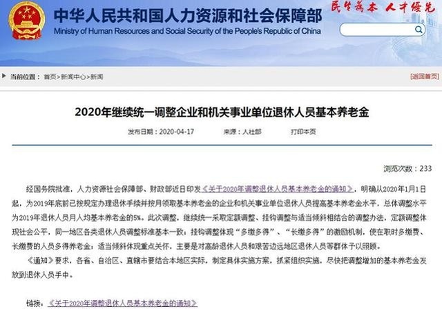 人力資源社會保障部 財政部關(guān)于2020年調(diào)整退休人員基本養(yǎng)老金的通知